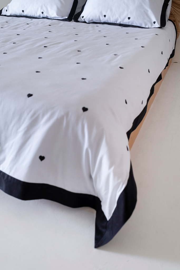 Nevresimin dört kenarını saran siyah kumaş zarif siyah kalp nakışlarıyla bütünlük sağlar.