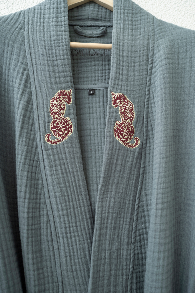Yakasındaki karşılıklı duran iki çita nakışı, tasarıma özgün bir karakter katar.