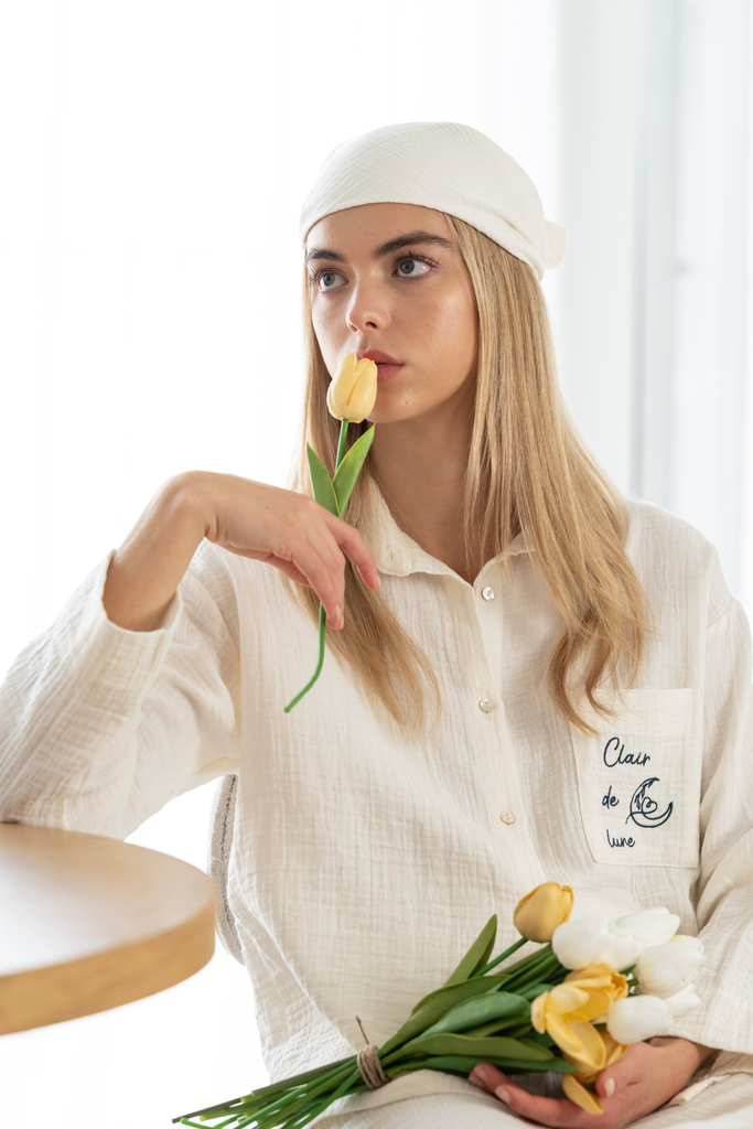 %100 pamuklu doğal ve nefes alan müslin kumaşıyla hafif, yumuşak ve tatlı bir uyku deneyimi sunar